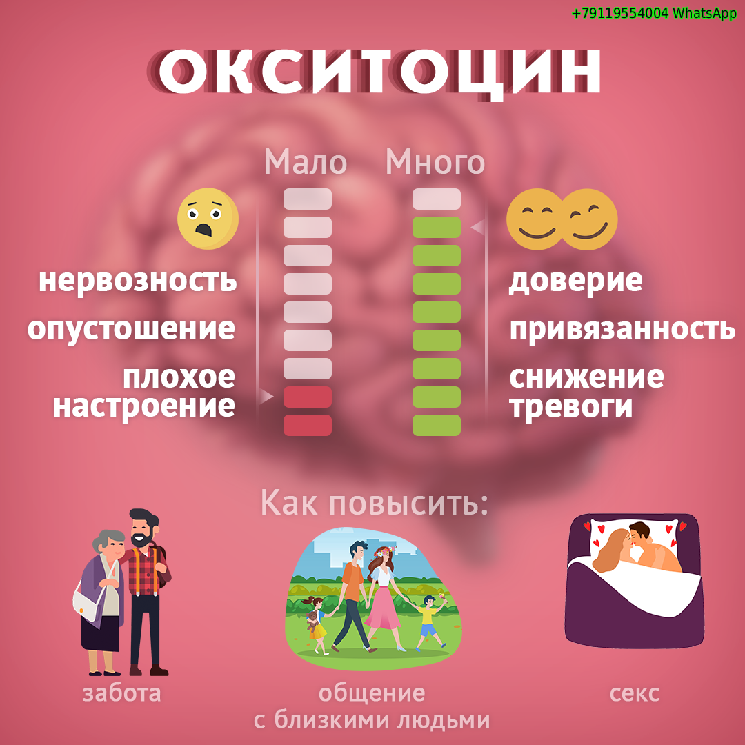 - окситоцин способствует выработке эндорфина, который называют гормоном счастья;